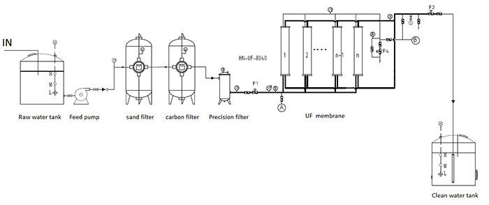原水箱-原水泵-錳砂過濾器-活性炭過濾器-微濾過濾器-中空超濾膜裝置(主機(jī))-無菌儲水罐-臭氧混合機(jī)-洗罐裝設(shè)備-燈檢