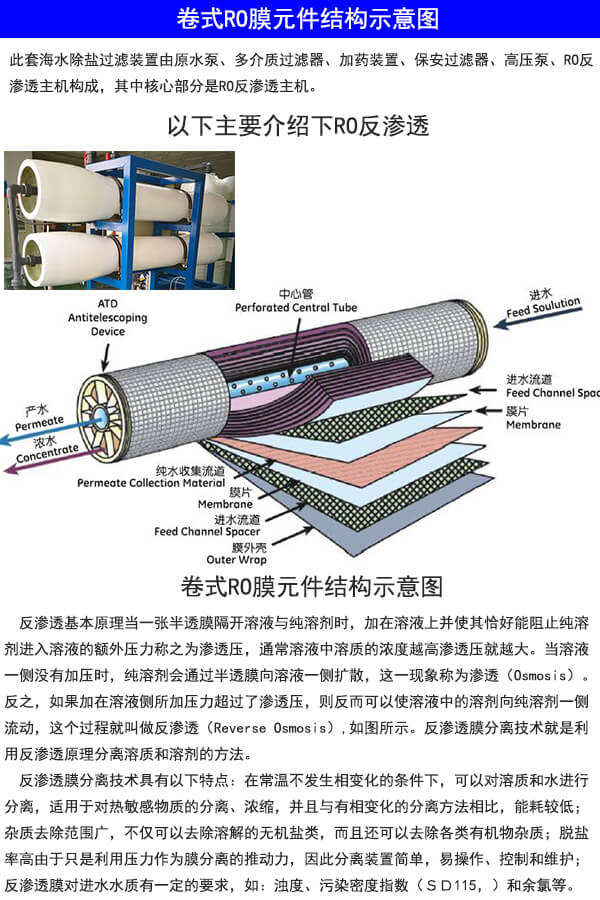 反滲透裝置主要包括多級高壓泵、反滲透膜元件、膜殼(壓力容器)、支架等組成。其主要作用是去除水中的雜質,使出水滿足使用要求。海水淡化系統。