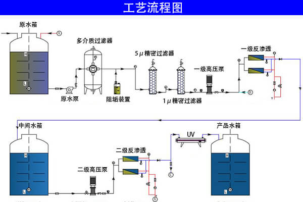 后處理系統是在反滲透不能滿足出水要求的情況下增加的配置。主要包括陰床、陽床、混床、殺菌、超濾、EDI等其中的一種或者多種設備。后處理系統能把反滲透的出水水質更好的提高,使之滿足使用要求。