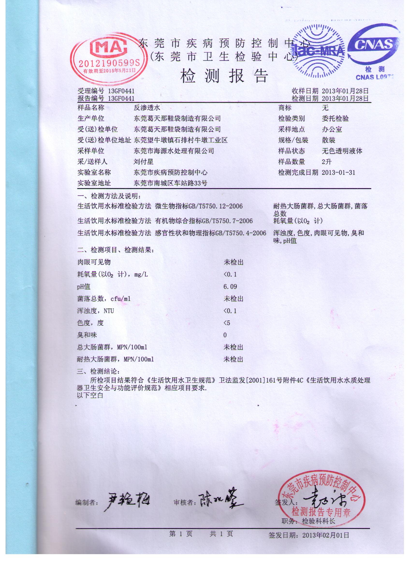 第一級采用石英]]>Sat, 16 Mar 2013 00:00:00 GMT<![CDATA[東莞葛天那鞋袋制造有限公司RO直飲水水質檢測報告]]>祝賀我司為東莞葛天那鞋袋制造有限公司提供RO直飲水機,現已安裝完畢,水質均符合直飲水檢測標準。